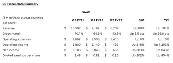 具体来说,NVIDIA第二季度营收为 135.1 亿美元,同比暴涨101%,环比大涨88%。远超NVIDIA此前给出的107.8亿到112.2亿美元的业绩指引,同时也超出了分析师预期同比增长约65%至110.4亿美元。