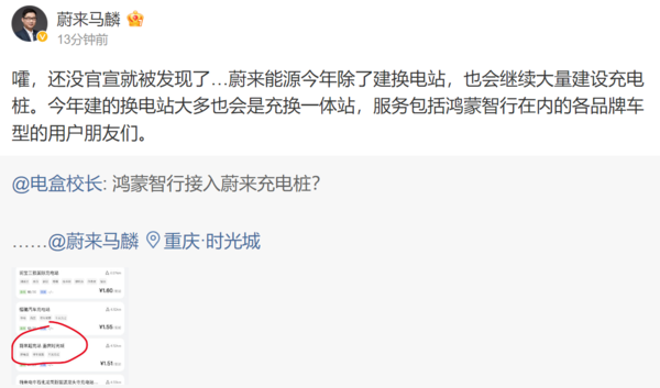 近日,有汽车博主发现,自己的鸿蒙智行品牌车辆在搜索附近充电站时居然出现了蔚来的超充站,其询问称:“莫非鸿蒙智行接入了蔚来充电桩?”在其发文后不久,蔚来品牌与传播助理副总裁马麟进行了回应。他留言称:“还没官宣就被发现了…蔚来能源今年除了建换电站,也会继续大量建设充电桩。今年建的换电站大多也会是充换一体站,服务包括鸿蒙智行在内的各品牌车型的用户朋友们。”