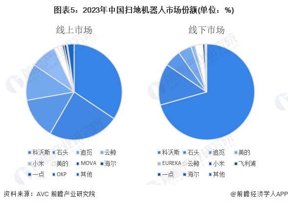 从市场份额集中度来看,中国扫地机器人线上及线下市场均较为集中,线上市场CR10集中度超过95%,线下市场CR10更是接近100%。由此可见,中国扫地机器人竞争格局趋于稳定,科沃斯、石头等领先品牌获得了大量的市场份额。