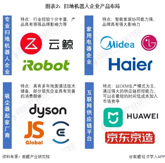 国内扫地机器人市场现阶段主要被四类企业占据:一是专业扫地机器人企业,包括石头科技、云鲸、iRobot等;二是进入扫地机器人领域的电器企业,包括美的、海尔、LG等;三是具有吸尘器技术专业背景企业,包括戴森、JS和科沃斯等;四是依托互联网供应链进入扫地机器人领域的小米、京东京造、华为等企业。