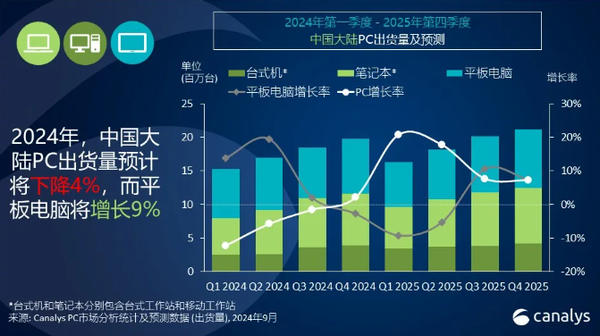 Canalys预测2024年平板电脑市场将持续向好,有望实现9%的增长,而PC市场则可能面临4%的下滑。不过,该机构也指出,这一趋势有望在2025年发生逆转,预计届时PC出货量将反弹增长12%,平板电脑出货量也将维持温和增长,达到1%。