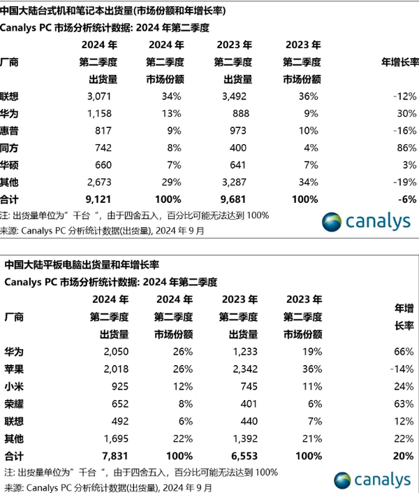 具体到二季度市场表现,中国大陆平板电脑领域,华为与苹果并驾齐驱,各自出货2000万级别(华为略高),共同占据26%的市场份额。然而,在年增长率上,华为以66%的显著增幅领跑,而苹果则录得-24%的下滑。小米紧随其后,出货量达到925万台,占据12%的市场份额,并实现了24%的年增长率。荣耀与联想分列第四、五位,出货量分别为652万和492万台。值得注意的是,除苹果外,前五名品牌均实现了年出货量的正增长。