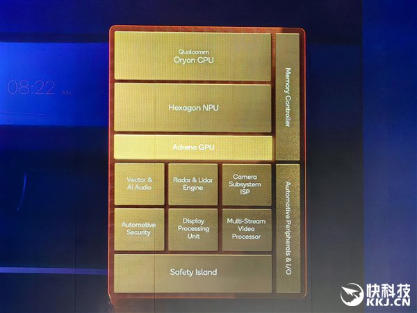 骁龙座舱至尊版处理器内除了针对汽车定制的Oryon CPU、Adreno GPU、Hexagon NPU三大件,还集成了诸多汽车相关功能模块,包括雷达与激光雷达引擎、摄像头子系统ISP、汽车安全单元、汽车外设与IO、DPU显示处理器、多流视频处理器、矢量与AI音频、独立安全岛。