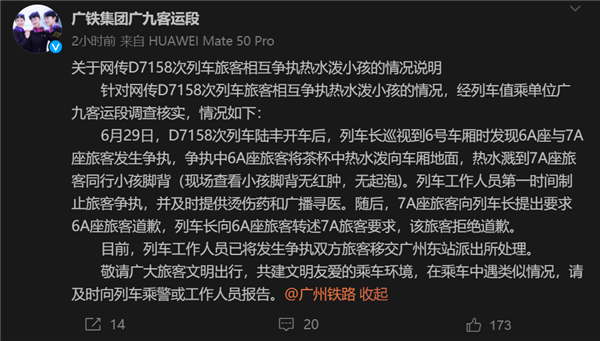 针对网传D7158次列车旅客相互争执热水泼小孩的情况,经列车值乘单位广九客运段调查核实,情况如下: