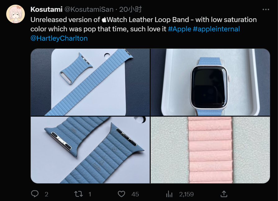 IT之家 6 月 30 日消息,著名苹果产品收藏家 Kosutami 昨日曝光了两款被砍的 Apple Watch 表带,分别是浅蓝色与粉色。